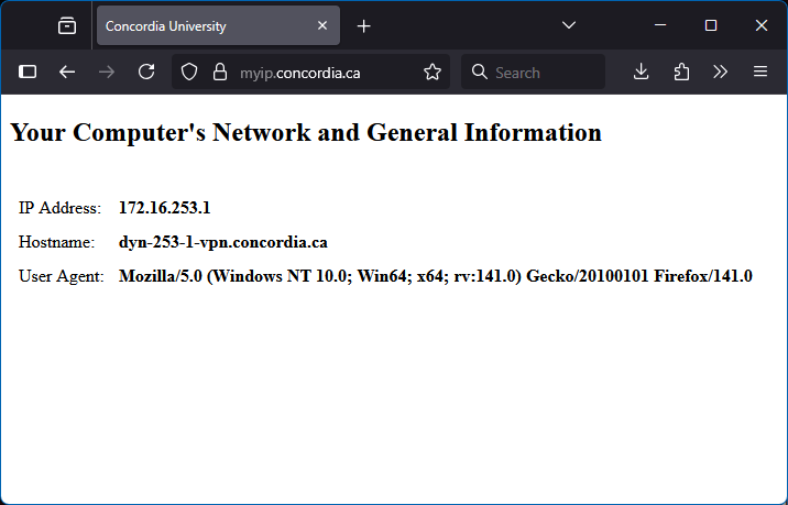 * One way to test this is to open the page https://myip.concordia.ca/. If you get a very minimal page titled "Your Computer's Network and General Information" showing nothing but your IP Address, Hostname, and Browser User Agent... Then you VPN connection is fully enabled! (or you were already at Concordia) 👍
